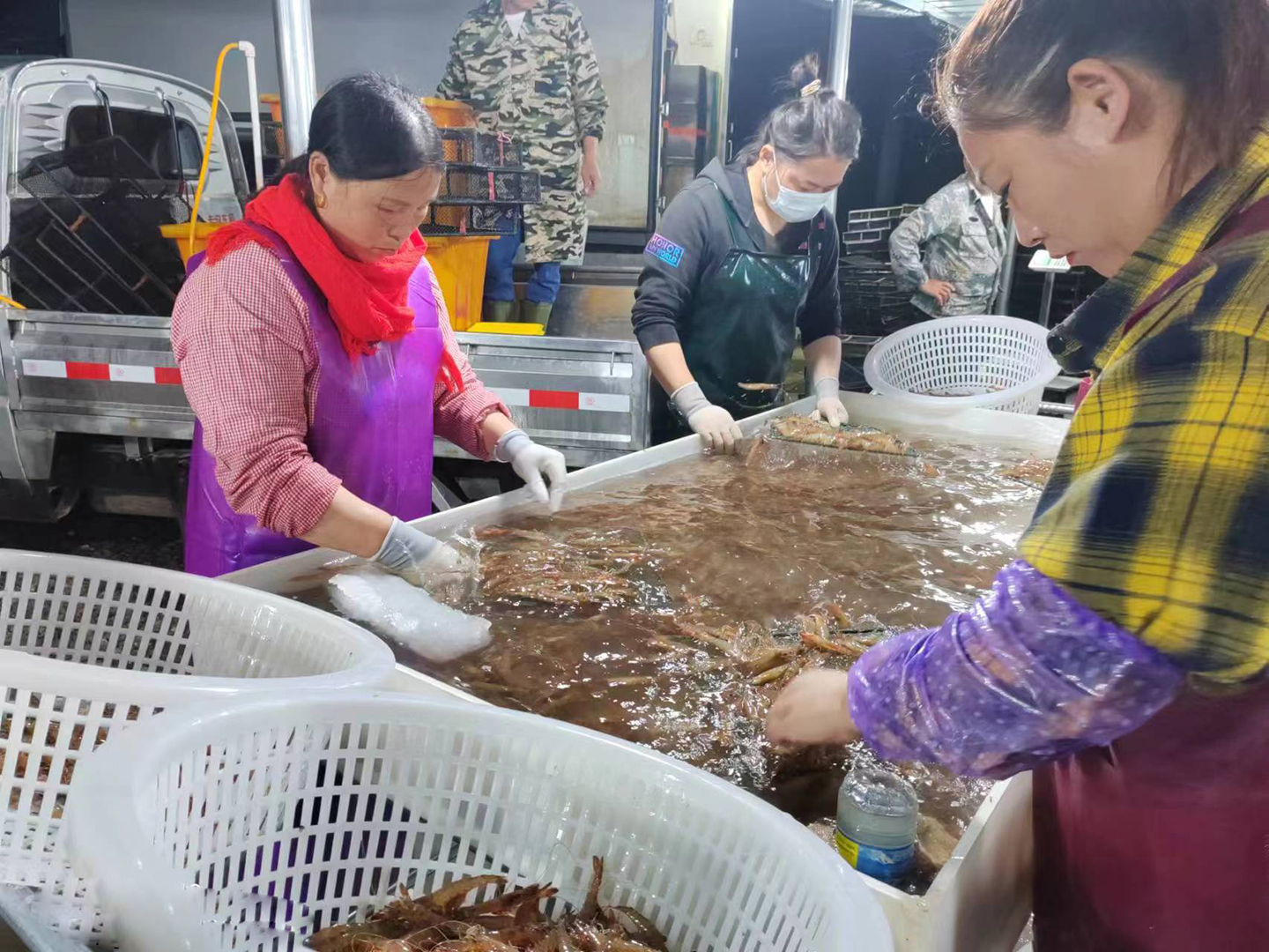 六月的初夏,灌東鹽場迎來了一年中第一波豐收季。在三圩養(yǎng)殖區(qū)的收購現(xiàn)場,忙碌的養(yǎng)殖戶將一筐又一筐的斑節(jié)蝦運送到集中收購點。夜幕下,工人們正熟練的分揀、打包。豐收的斑節(jié)蝦吸引了大批的客商前來收購,一筐筐剛上岸的蝦就被客商搶購一空,被運往全國各地市場進(jìn)行銷售,2萬多畝的養(yǎng)殖塘口內(nèi)車水馬龍,一派繁忙景象。2023-06-21 -