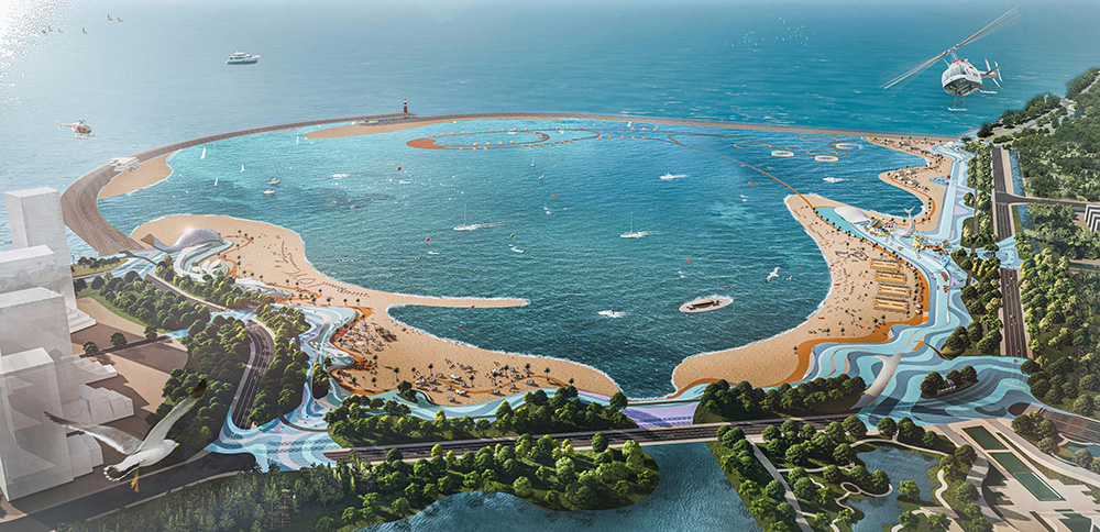 該項(xiàng)目位于月亮灣旅游度假區(qū)海堤外側(cè),以海濱文體旅游綜合體為定位,以2012年四條鯨魚擱淺新灘鹽場(chǎng)附近事件為引,結(jié)合古黃河文化和海洋文化,構(gòu)建以“鯨魚沙灘”為主題的IP。浴場(chǎng)主要功能為旅游、娛樂、度假、海洋科普教育、康體運(yùn)動(dòng)、專業(yè)賽事、遠(yuǎn)洋觀光、節(jié)慶活動(dòng)等,按照分區(qū)設(shè)計(jì),項(xiàng)目整體設(shè)計(jì)分為四大主題和特色體驗(yàn)區(qū),四大主題分別為“鯨舞”“鯨憩”“鯨游”“鯨躍”等主題板塊,十二個(gè)特色體驗(yàn)區(qū)為抹香鯨主題中心、商業(yè)美食街區(qū)、露營(yíng)基地、水上運(yùn)動(dòng)區(qū)、沙灘體育基地、主題水上樂園、海上舞臺(tái)、海上度假區(qū)、帆船中心、遠(yuǎn)洋觀光區(qū)、浪漫藝術(shù)海岸、漂浮體驗(yàn)區(qū)。